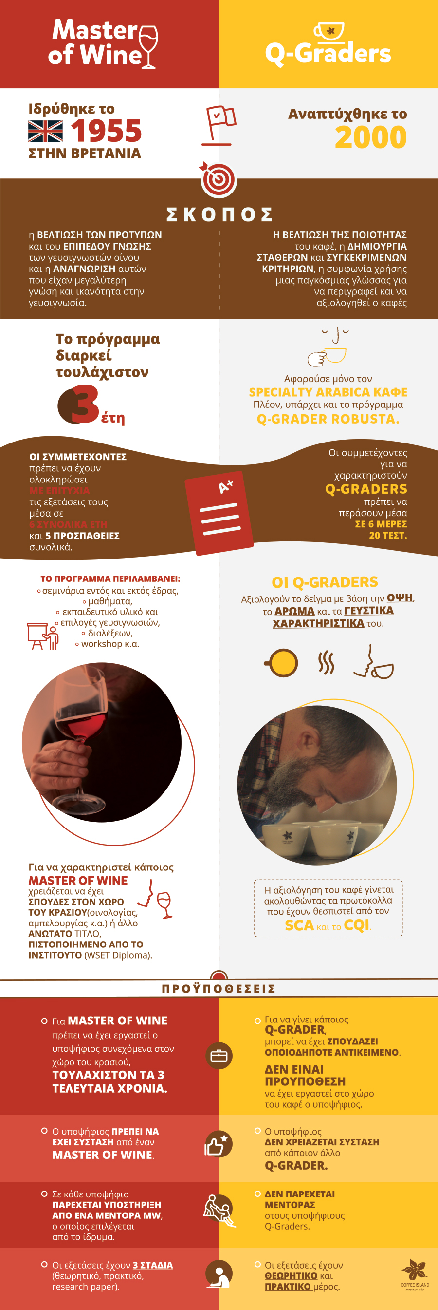Q-Grader is the coffee taster certified by the Coffee Quality Institute (CQI). Q-Graders are members of a global community. This is the highest title in coffee tasting. There are around 6,481 Q-Graders in 87 countries. In Greece, there are 10 certified “coffee specialists”, of whom three work in Coffee Island. A Q-Grader is able to evaluate, score and also set market prices of green coffee. It is of paramount importance that Q-Graders are calibrating their taste buds quite regularly. Q-Grader’s title has to be renewed every 5 years.