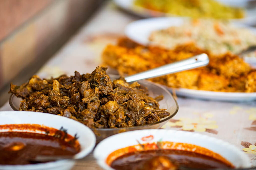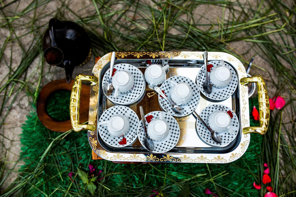 Symbolizing the good and positive energy, green leaves and colorful flowers had been scattered all over the road. Finally, through a maze of dirt roads, central highways and makeshift passes between houses, we arrived at a beautiful home that smelled of freshly cooked food where the soil was also scattered with leaves and flowers. In the center of the courtyard, which was surrounded by the family’s houses, a fire was slowly burning in a traditional earthenware pot. Coffee mugs were spread out ready for after dinner.