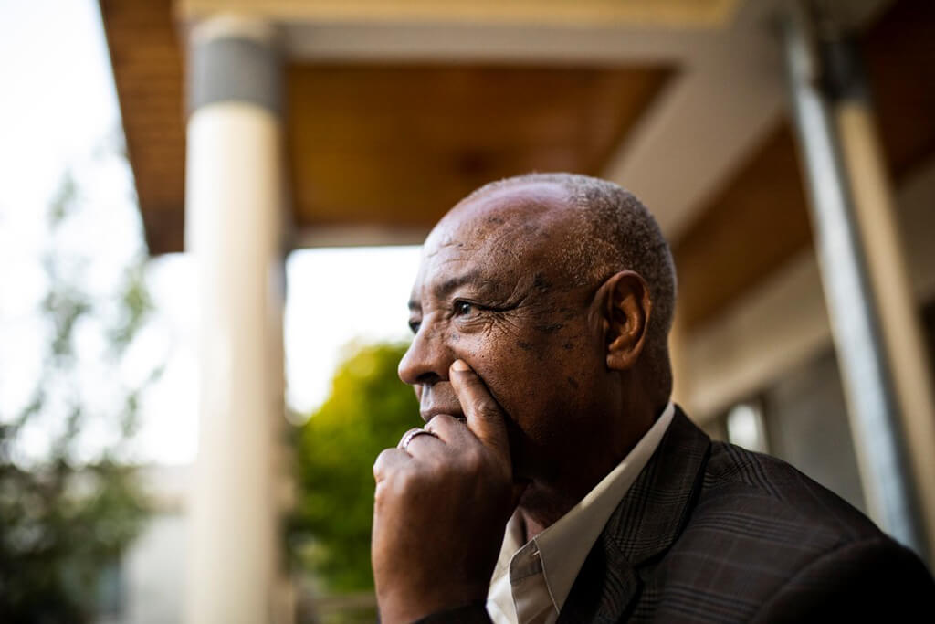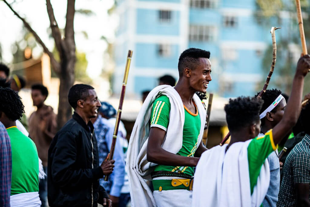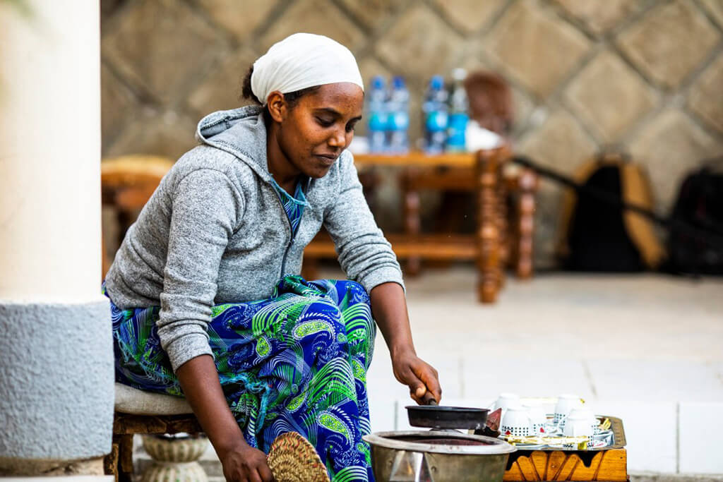 The yard was full now. The women of the family began preparing the coffee that would accompany the meal. It was a long and beautiful process since everything is done ritually and from scratch as the coffee beans are still unroasted. The aroma of the coffee slowly began to circulate in the air and eventually overwhelmed all our senses. Roasting, grinding, boiling and serving – all with the respect that a good coffee deserves. There is no other way for Ethiopians to drink their coffee, as they always do it daily with the same dedication.